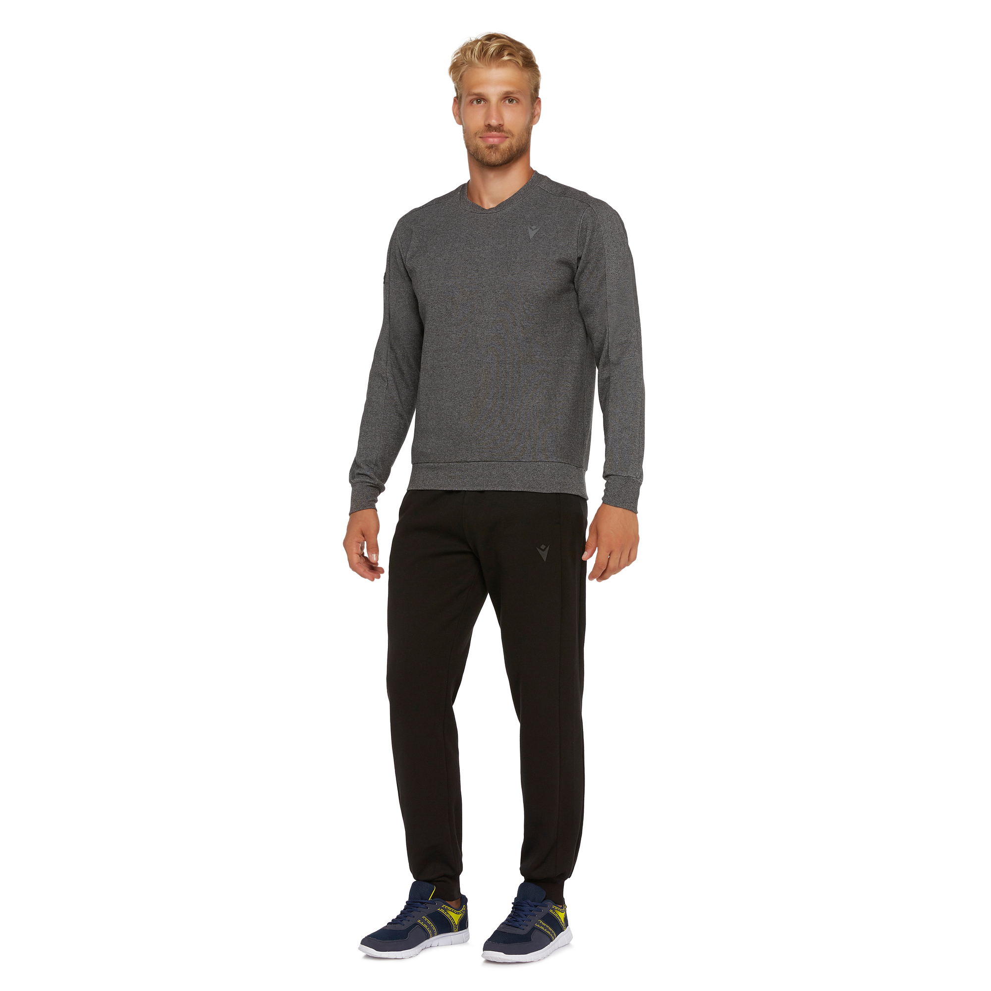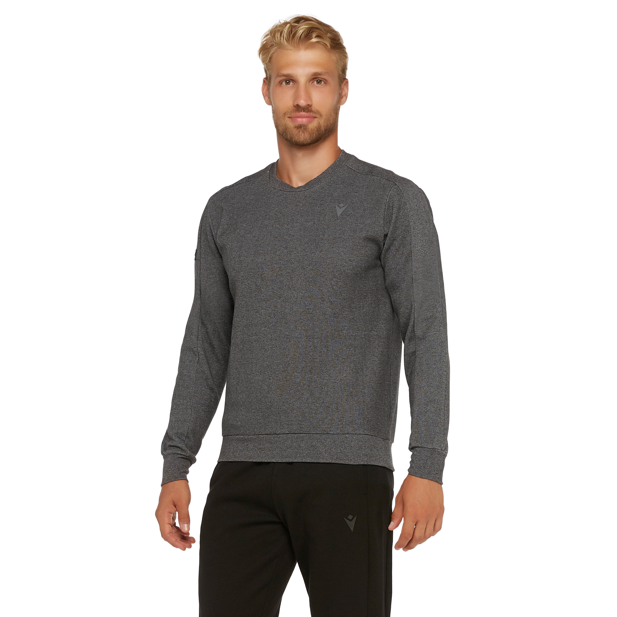 Bluza z okrągłym dekoltem Bodo, wykonana z bawełny Interlock, daje pewną gwarancję całkowitej miękkości i wygody. Wytłoczona gumowa naszywka z logo MACRON w kolorze czarnym, widoczna na lewym rękawie dodaje elegancji i stylu. Ubranie ma również prążkowany kołnierz, mankiety i pas. Całość dodatkowo podkreśla melanż.